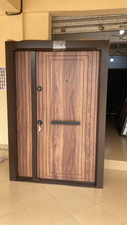 A contemporary Turkish steel door combining sleek black vertical lines with a warm walnut woodgrain accent. Featuring a slim vertical handle and a reinforced steel frame, it delivers modern elegance, durability, and enhanced security for stylish home and office entrances.