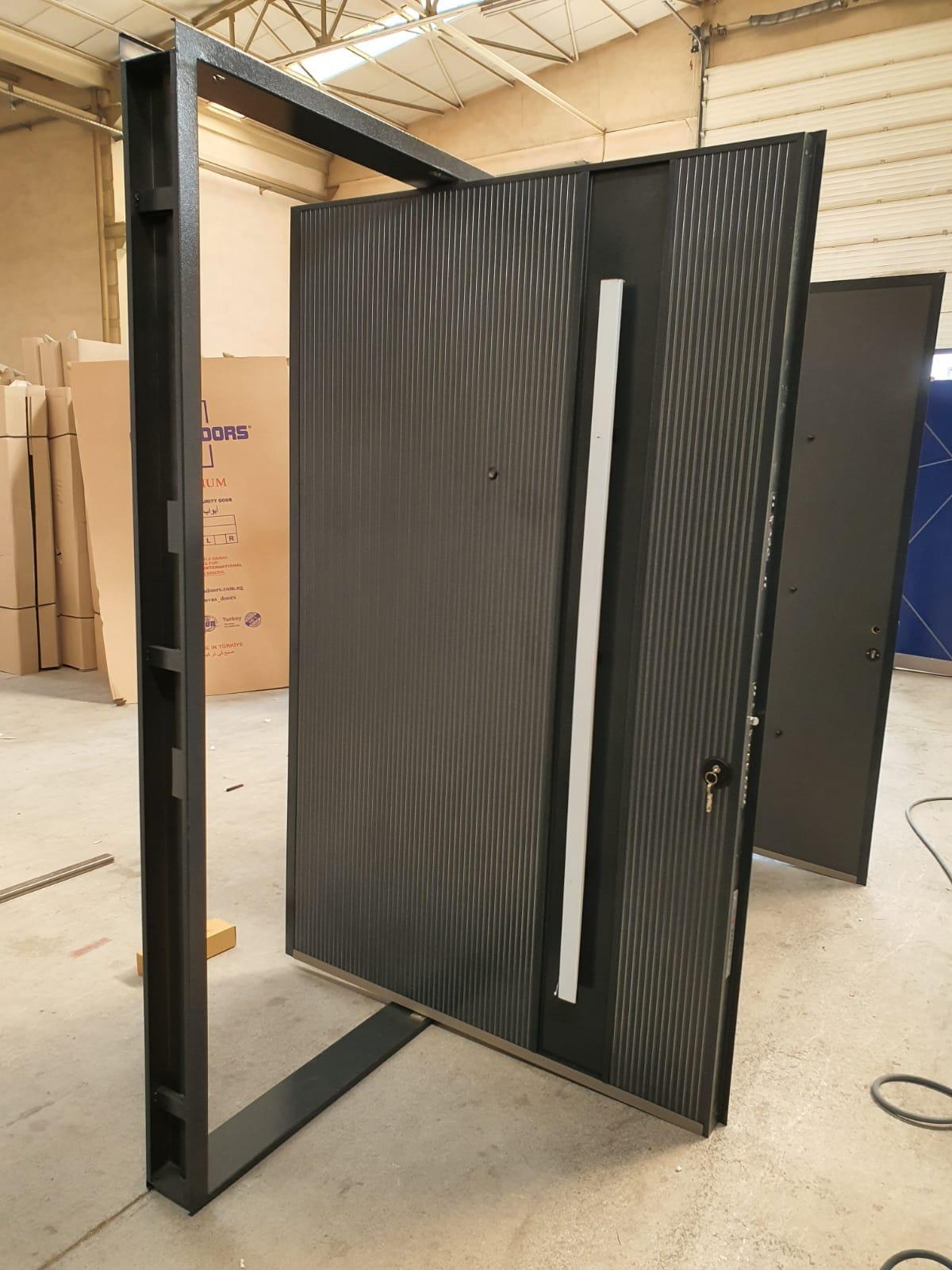 A contemporary Turkish steel door combining sleek black vertical lines with a warm walnut woodgrain accent. Featuring a slim vertical handle and a reinforced steel frame, it delivers modern elegance, durability, and enhanced security for stylish home and office entrances.